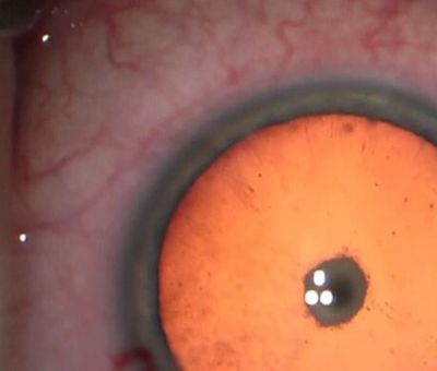 A 33-year-old man presents to your clinic with blurry vision in his right eye. He tells you that for quite some time, his vision has been worse in the right eye, and he is especially bothered by the glare of lights when driving at night. His BCVA OD is 20/30. Your slit lamp examination findings are shown below. Based on this finding, you recommend cataract surgery to the patient. However, as you plan his surgery, you note that your approach will be different than a “routine” case.